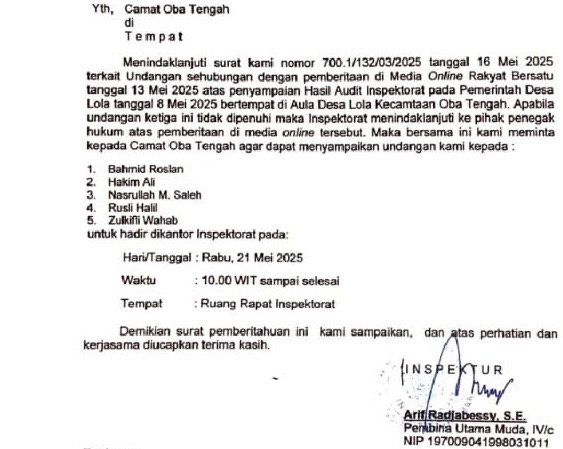 Menyusul setelah beredarnya surat undangan dikirimkan  Inspektorat tertanggal 20 Mei 2025 kepada Camat Oba Tengah, Kota Tidore Kepulaun.